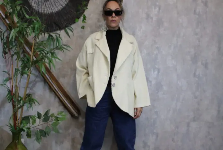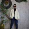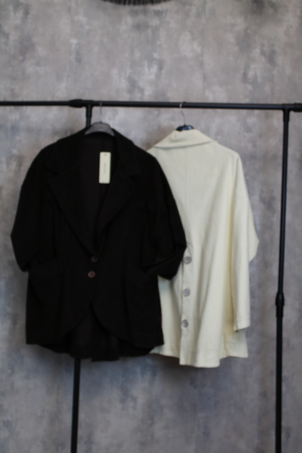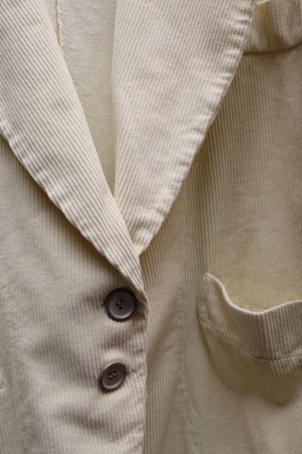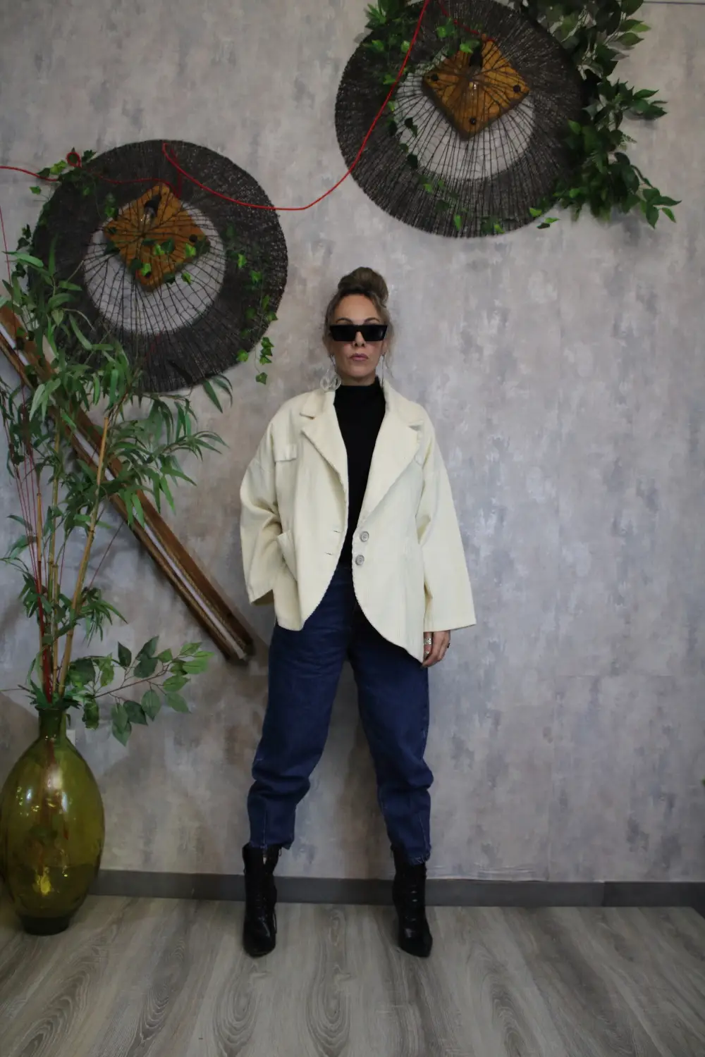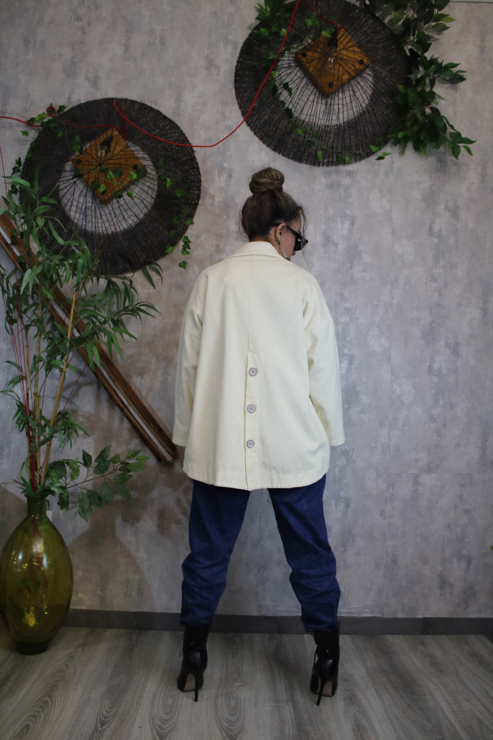 Casual σακάκι από βαμβακερό κότλε ύφασμα, σε κομψούς χρωματικούς συνδυασμούς εκρού και καφέ. Ξεχωρίζει για την ιδιαίτερη διακόσμηση με κουμπιά στο πίσω μέρος, προσθέτοντας στυλ και χαρακτήρα στο look.