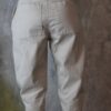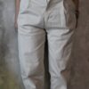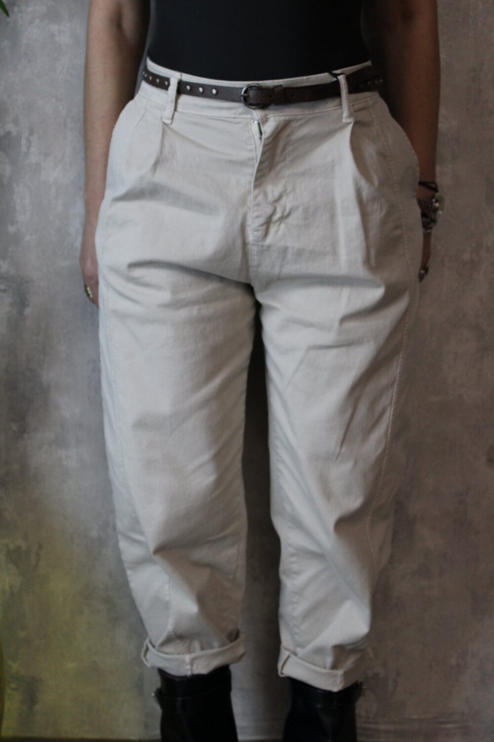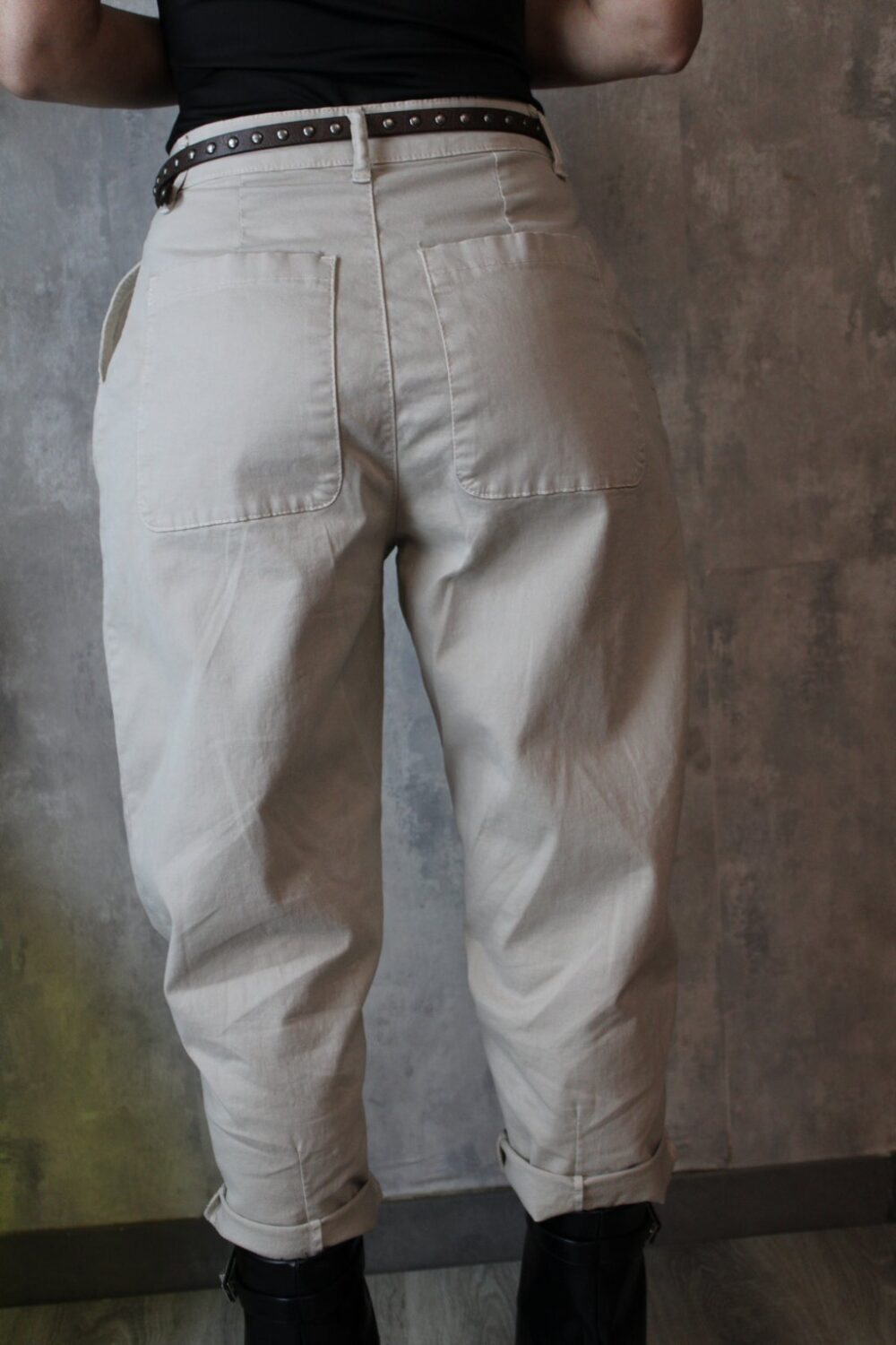 Υφασμάτινο παντελόνι σε μπεζ χρώμα, με ελαστική σύνθεση για άνεση και σωστή εφαρμογή. Διαθέτει πιέτες στο μπροστινό μέρος και διακοσμητικά γαζιά που ξεκινούν από τη μέση και καταλήγουν έως το μπατζάκι, προσθέτοντας ιδιαίτερη αισθητική στο σχέδιο.