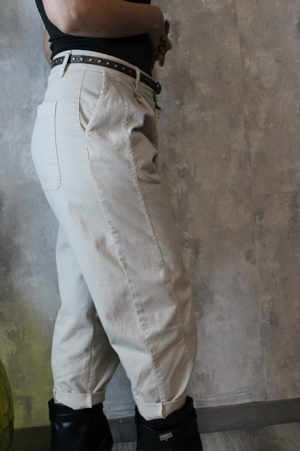 Είναι ψηλόμεσο, με τσέπες μπροστά και πίσω, ενώ η γραμμή του είναι φαρδιά τύπου boyfriend, ιδανική για άνετες αλλά στιλάτες εμφανίσεις.