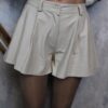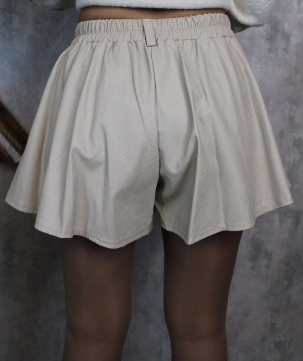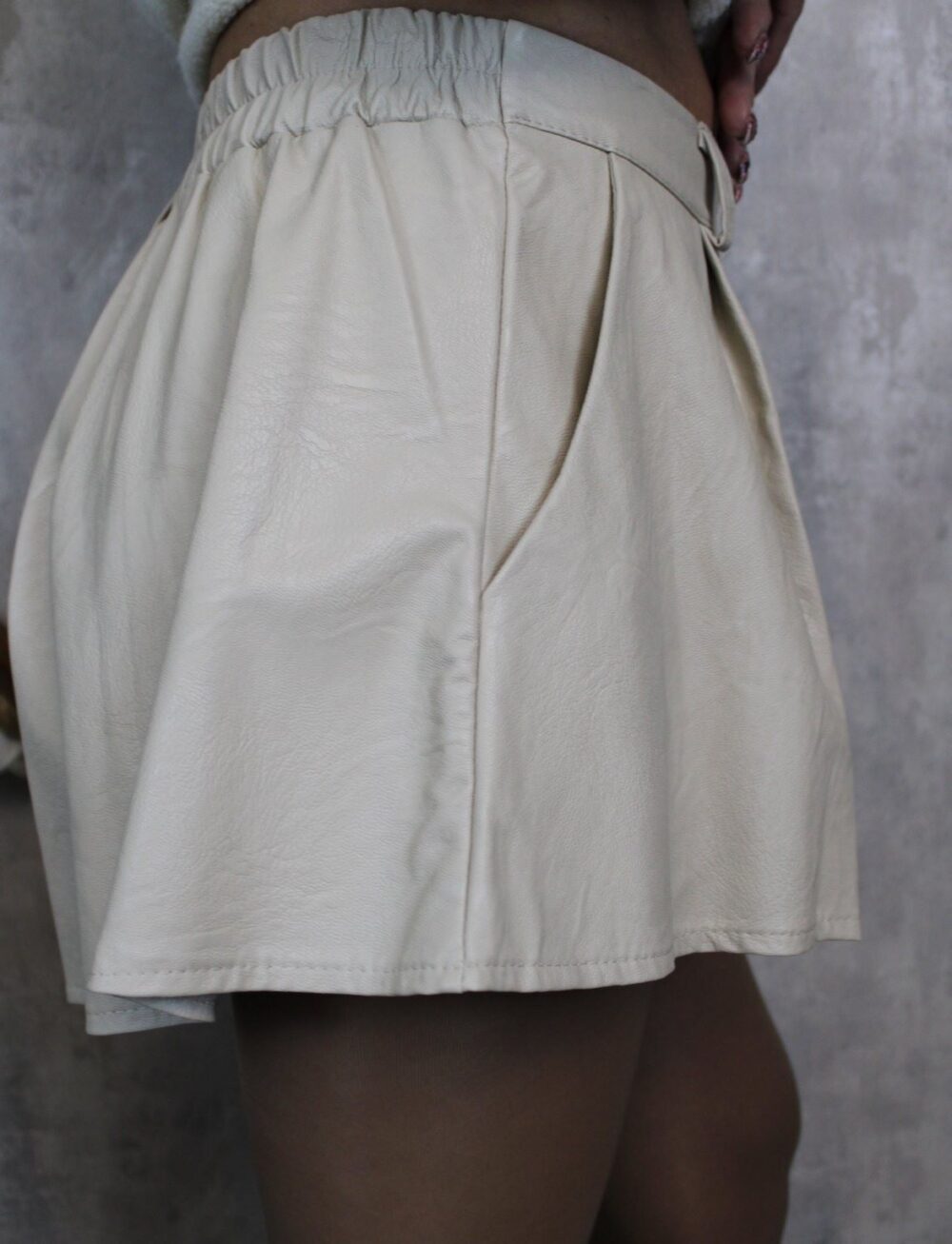 Ελαστικό σορτς δερματίνης με λάστιχο στο πίσω μέρος της μέσης για άνετη εφαρμογή. Διαθέτει πιέτες στο μπροστινό μέρος, κουμπί και φερμουάρ για σωστή εφαρμογή, καθώς και τσέπες.