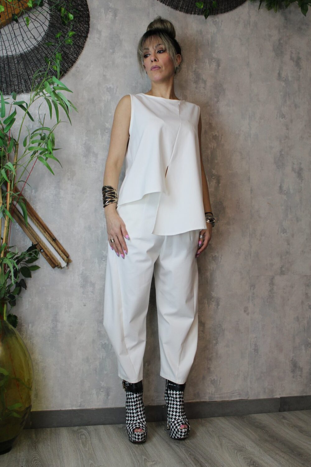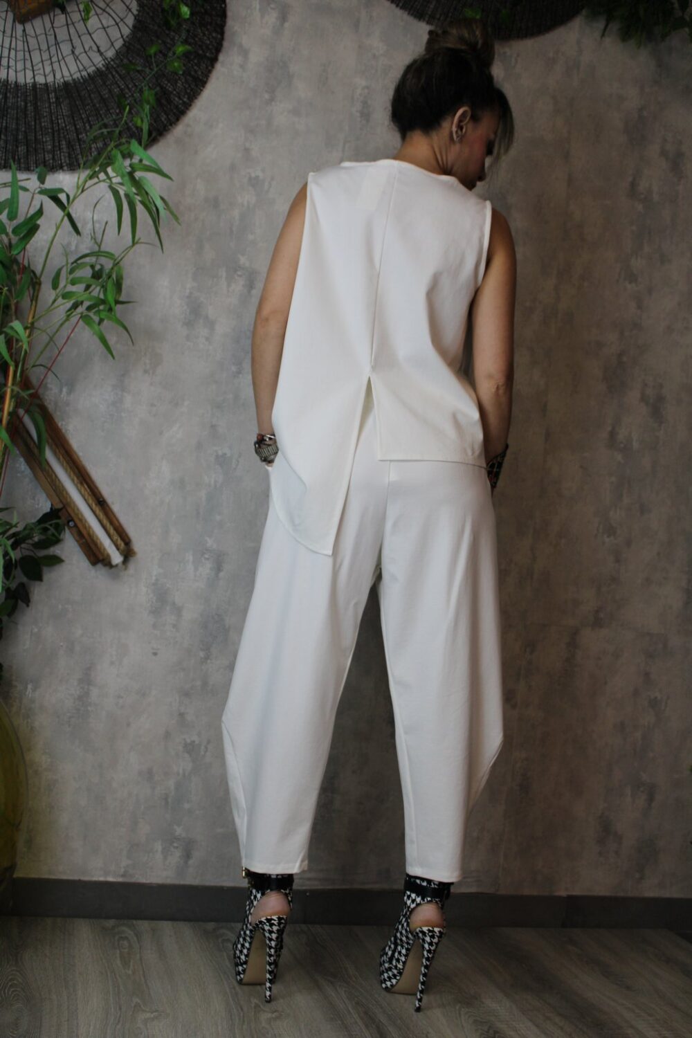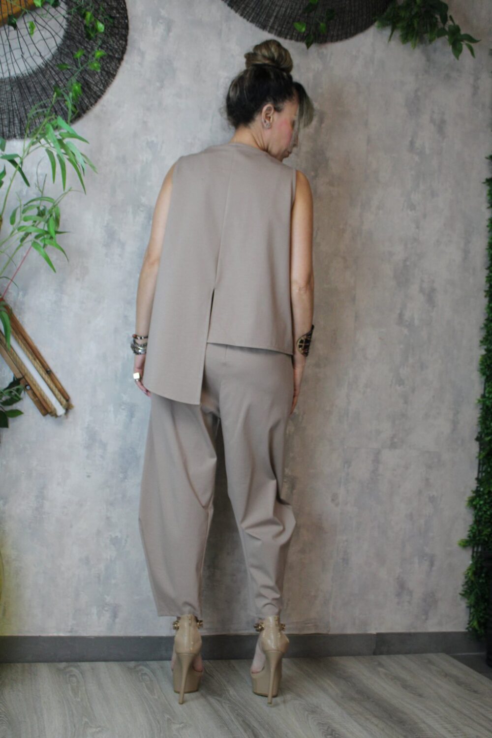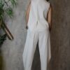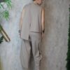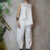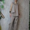 Η μπλούζα είναι αμάνικη, με μικρά σκισίματα μπροστά και πίσω, ενώ στη μία πλευρά είναι πιο μακριά, προσφέροντας μοντέρνα και χαλαρή γραμμή.