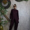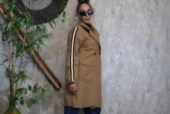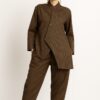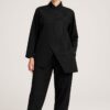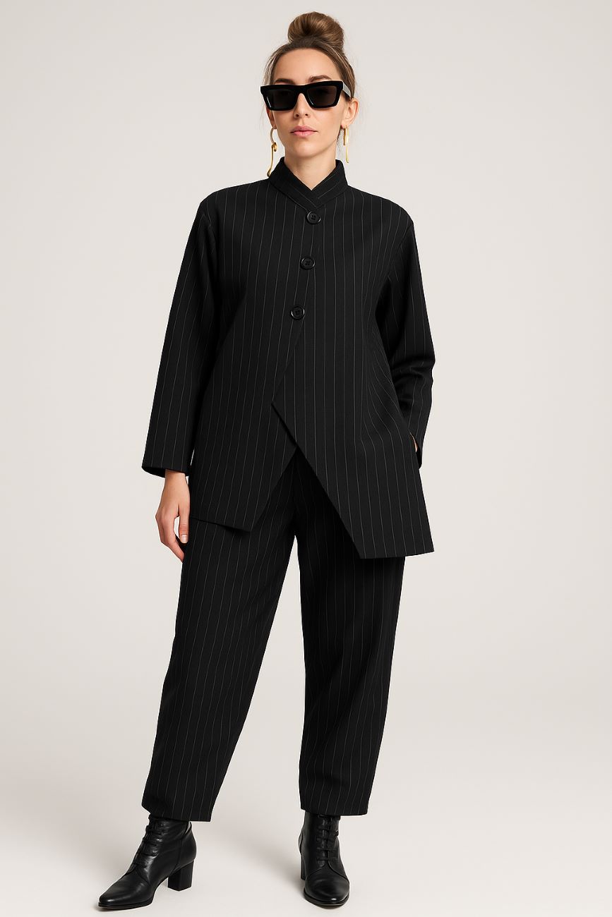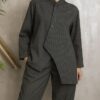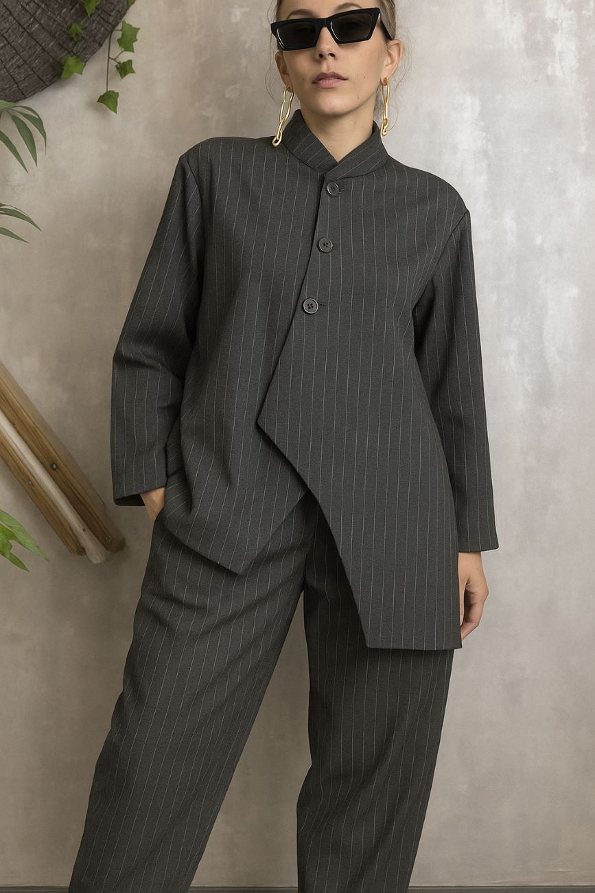 Η ζακέτα διαθέτει λοξά κοψίματα, μάο γιακά και κουμπιά μπροστά, προσφέροντας μοντέρνα και κομψή εμφάνιση.