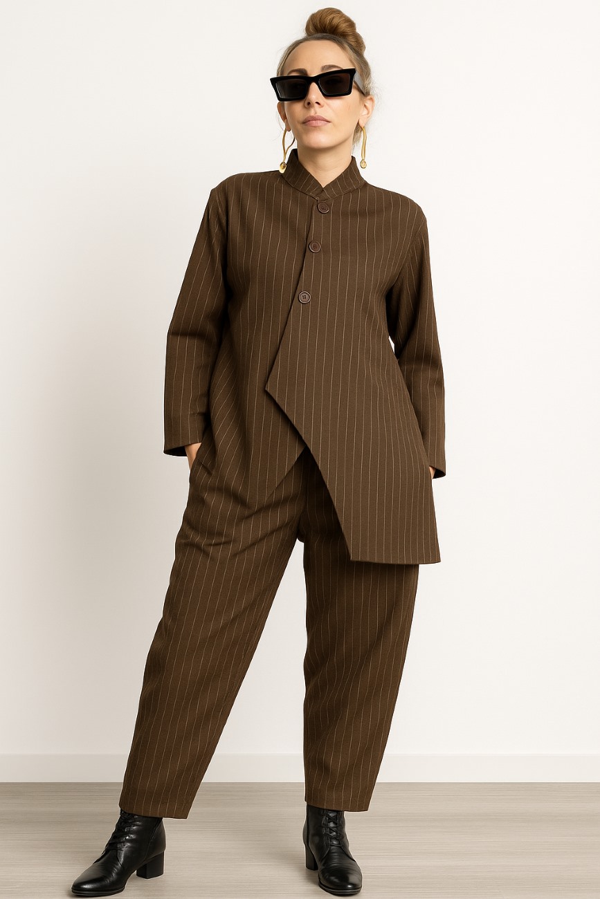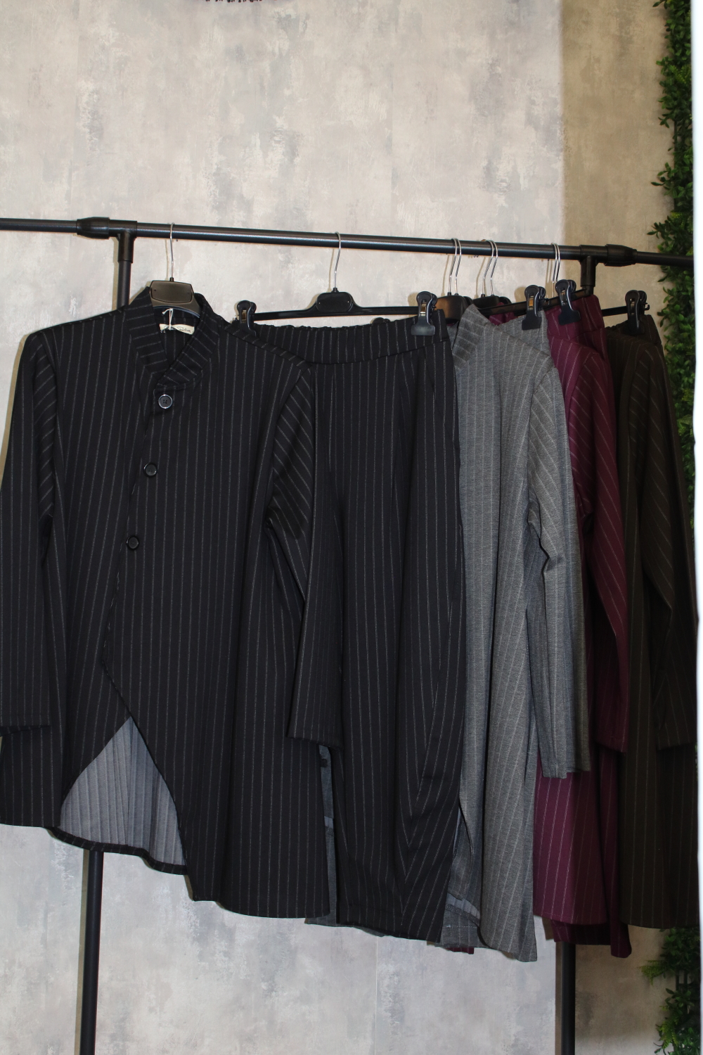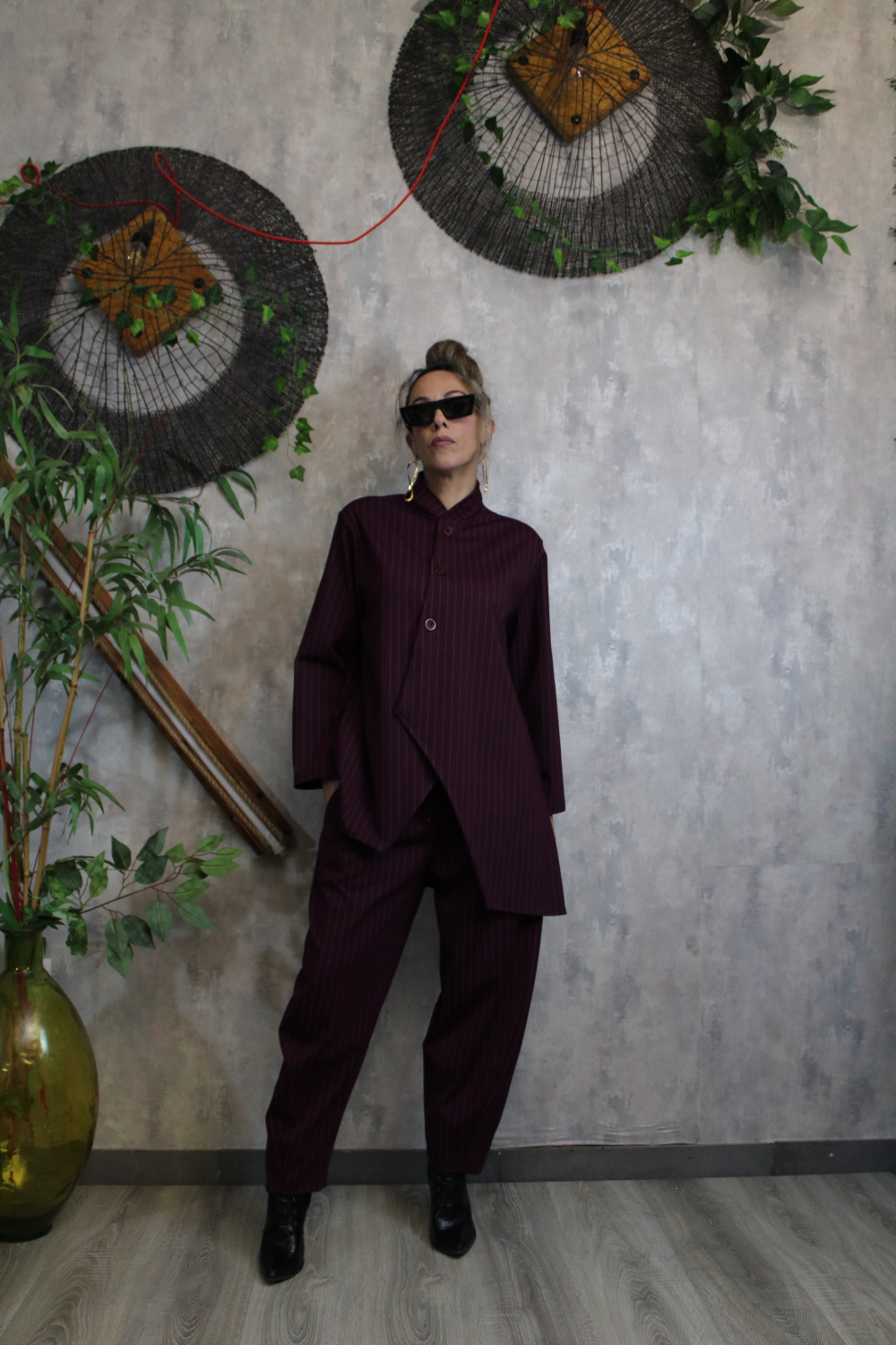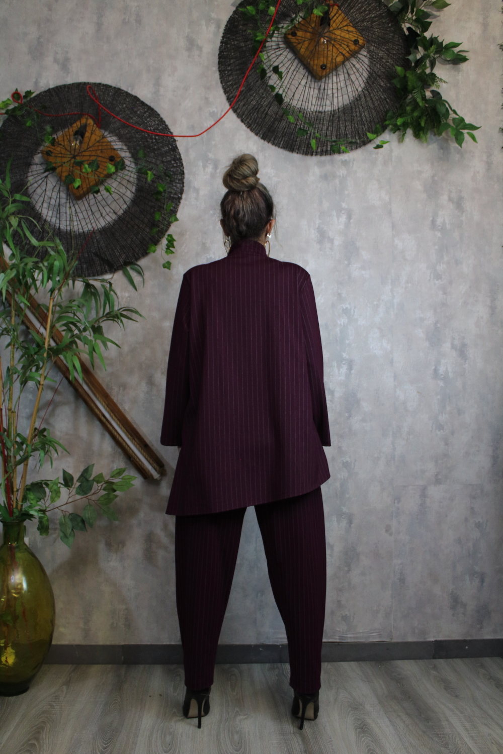 Σετ ριγέ δύο τεμαχίων με ζακέτα και παντελόνι σε φαρδιά, άνετη γραμμή.
