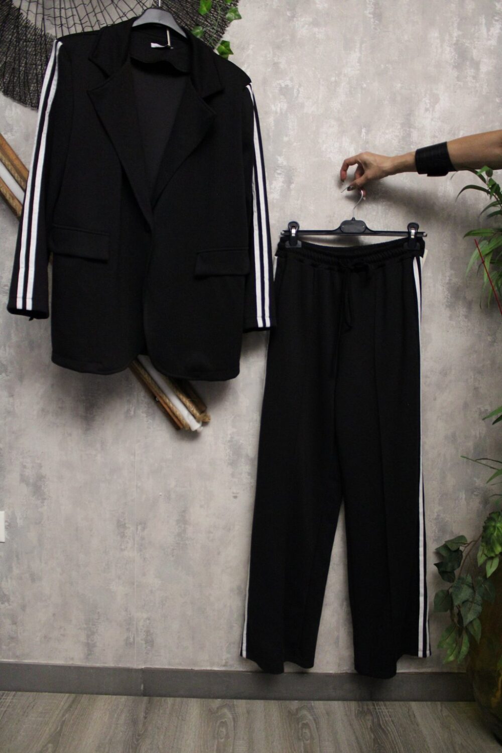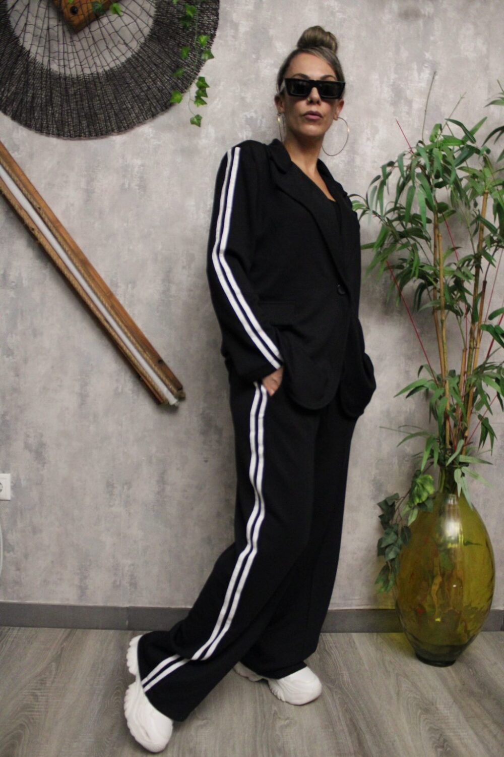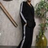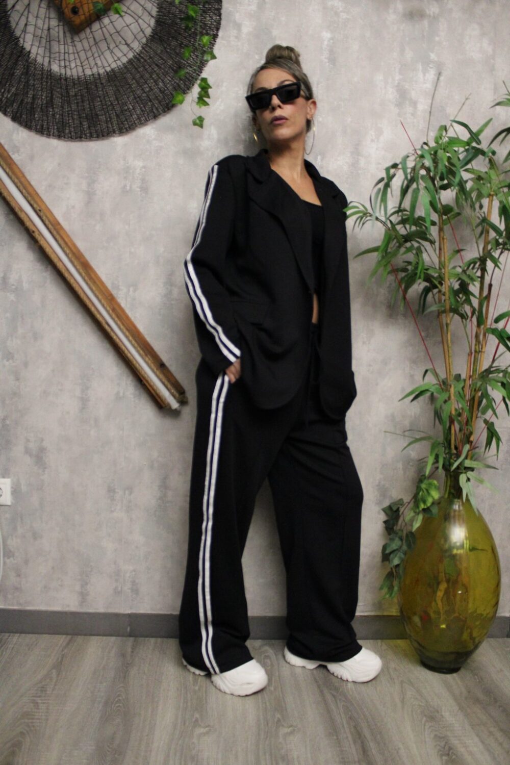 Το σακάκι διαθέτει δύο λευκές ρίγες στα μανίκια, πέτo στον γιακά και διακοσμητικές τσέπες — τέλειος συνδυασμός sport & chic.