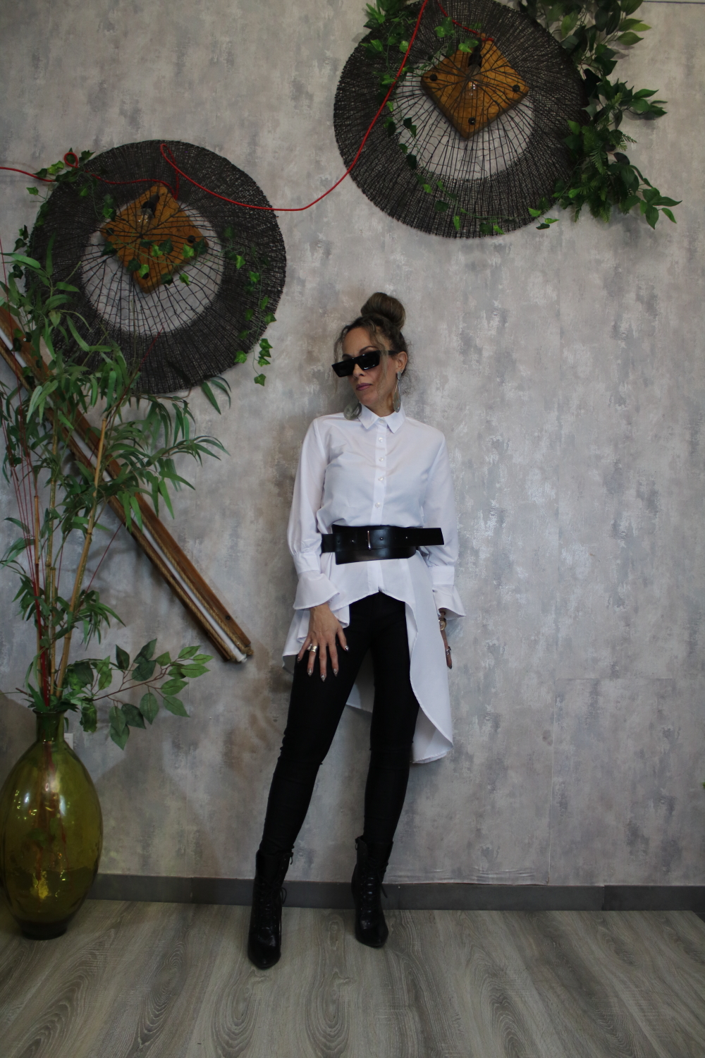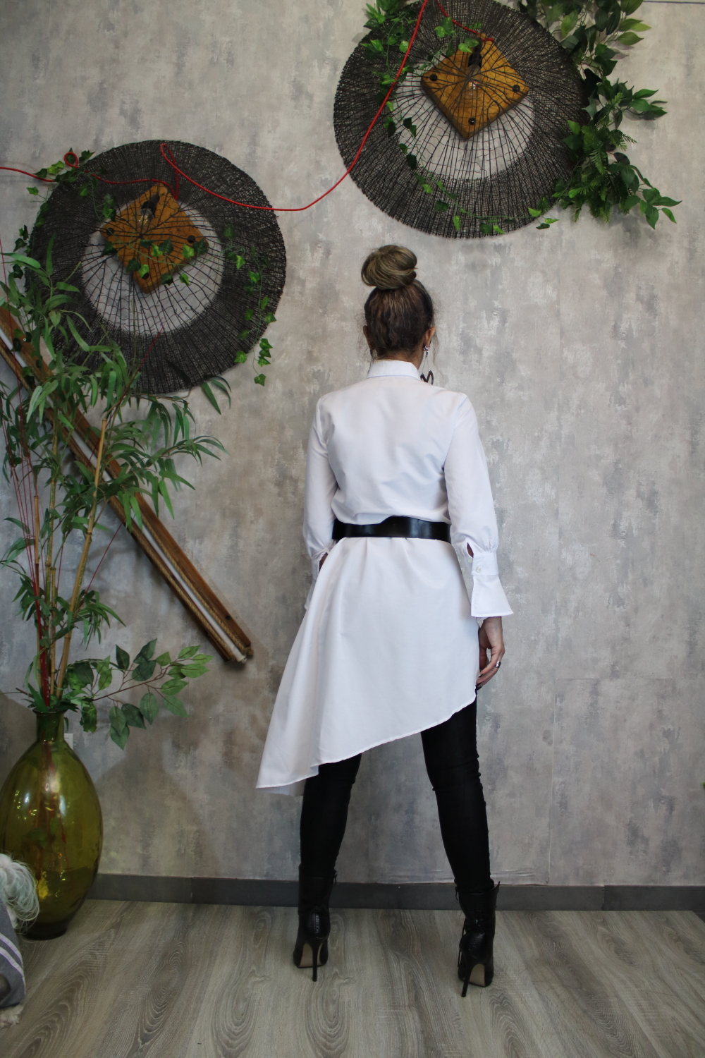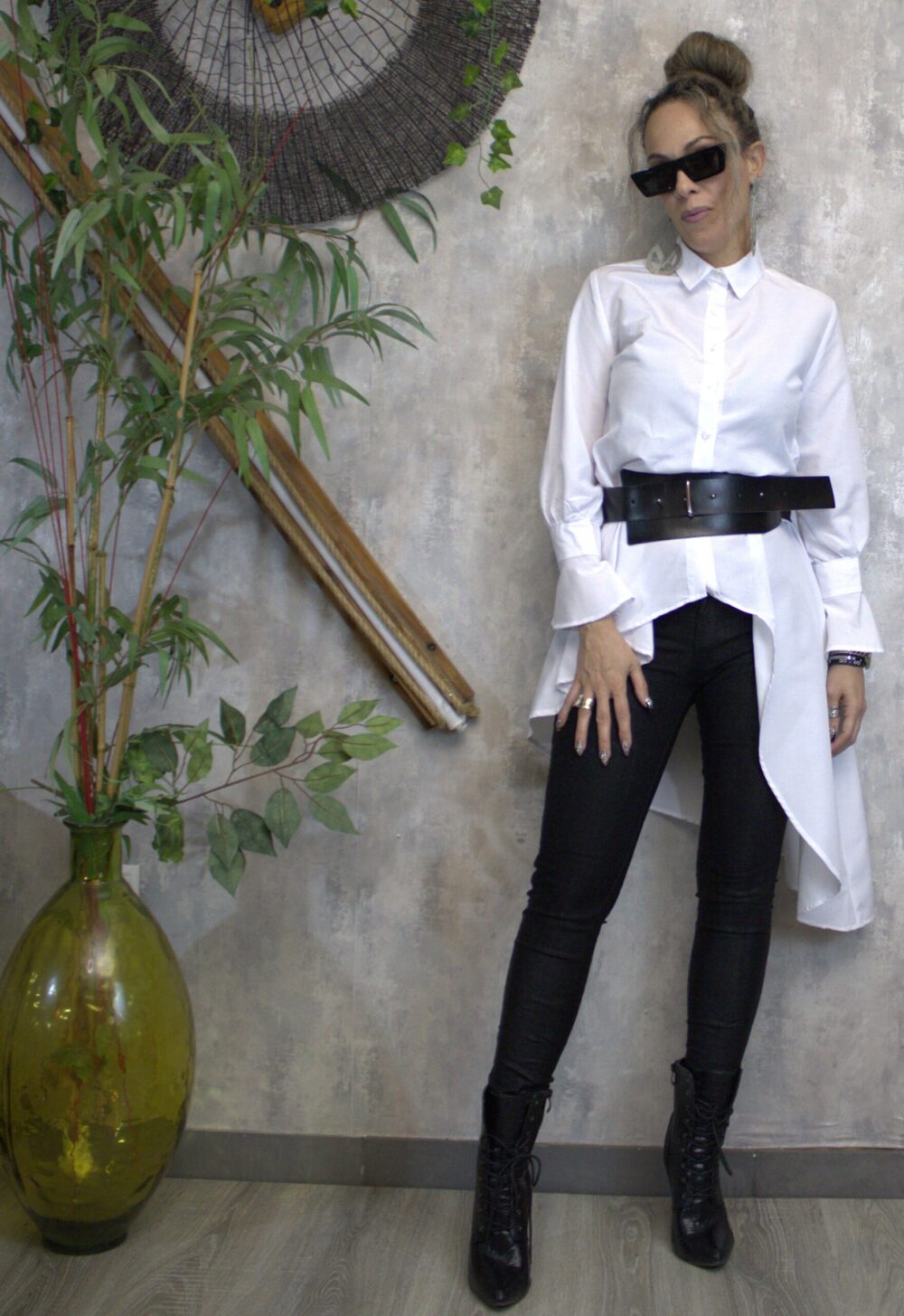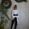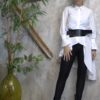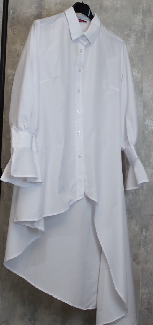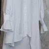 Εντυπωσιακό λευκό πουκάμισο με ασύμμετρο κόψιμο και ιδιαίτερο σχέδιο στα μανίκια με διακριτικά βολάν. Κλείνει με κουμπιά μπροστά και προσφέρει άψογη εφαρμογή που συνδυάζει κομψότητα και άνεση. Μπορεί να φορεθεί τόσο με ζώνη για πιο τονισμένη μέση όσο και χωρίς, για πιο χαλαρό στυλ.