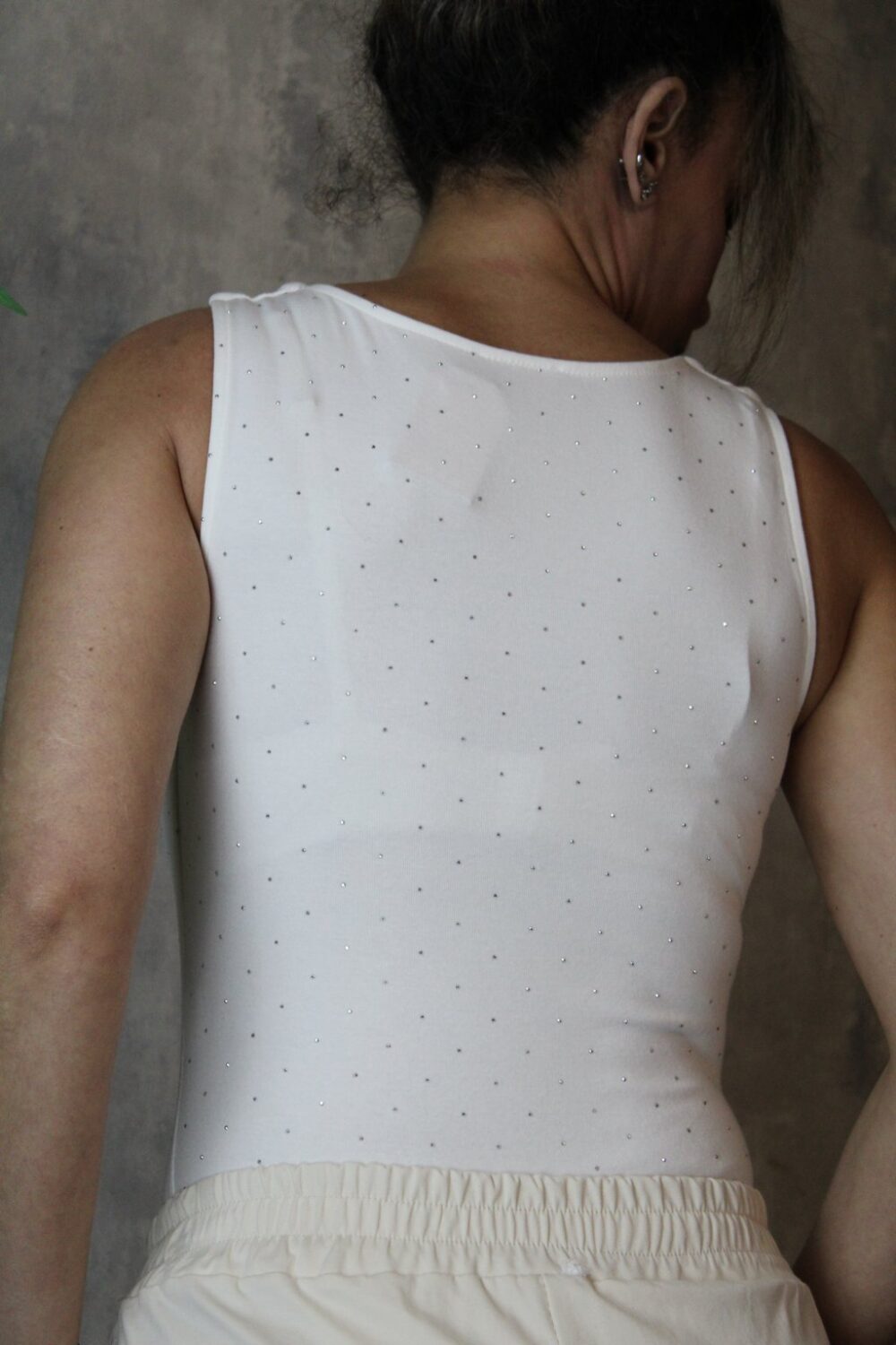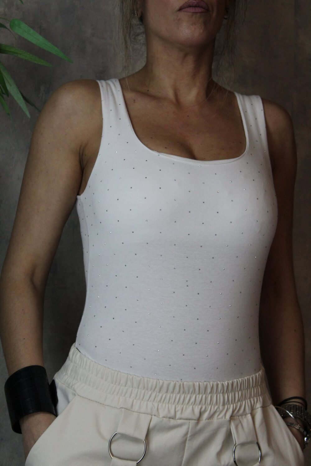 Λευκό ελαστικό κορμάκι, ιδανικό για κομψές αλλά και καθημερινές εμφανίσεις. Διαθέτει φαρδιές τιράντες για άνετη στήριξη και διακριτικά στρασάκια μπροστά και πίσω, που προσθέτουν λάμψη χωρίς υπερβολή.
